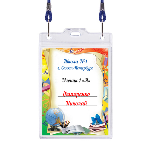 Именной бейдж на текстильном шнурке с двумя карабинами. Карман из мягкого прочного пластика гарантирует долгий срок службы.