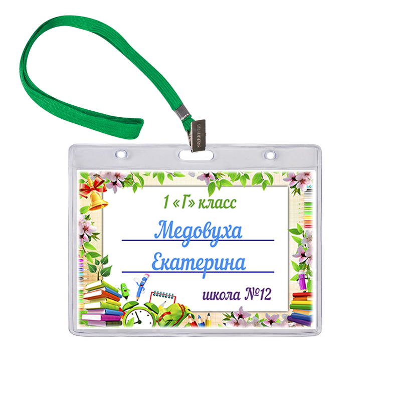 Именной бейдж для первоклассника из прозрачного мягкого пластика со шнурком.
