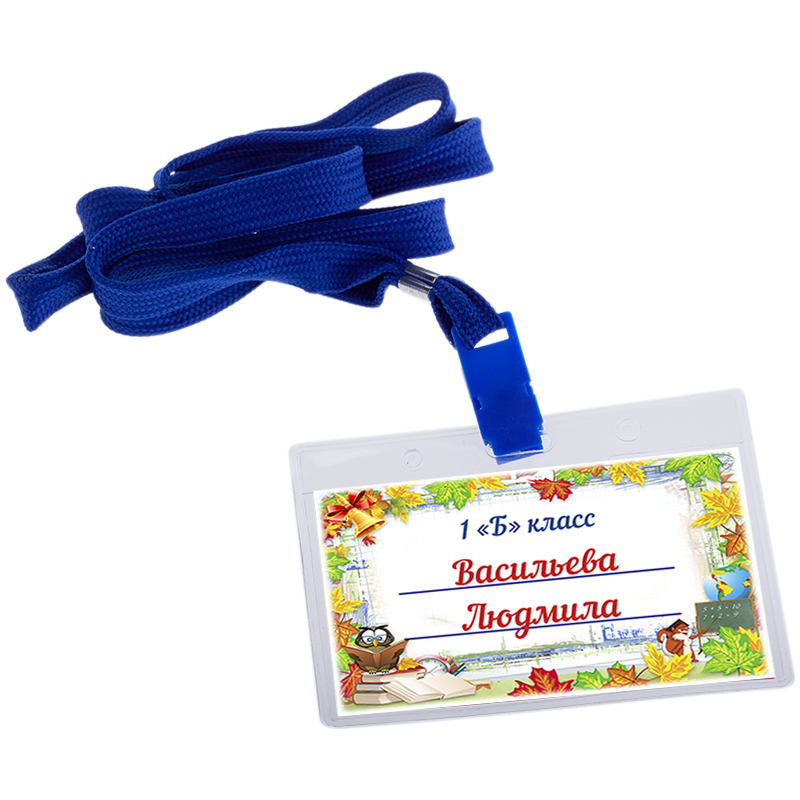 Именной бейдж для первоклассника из прозрачного мягкого пластика со шнурком с клипсой.