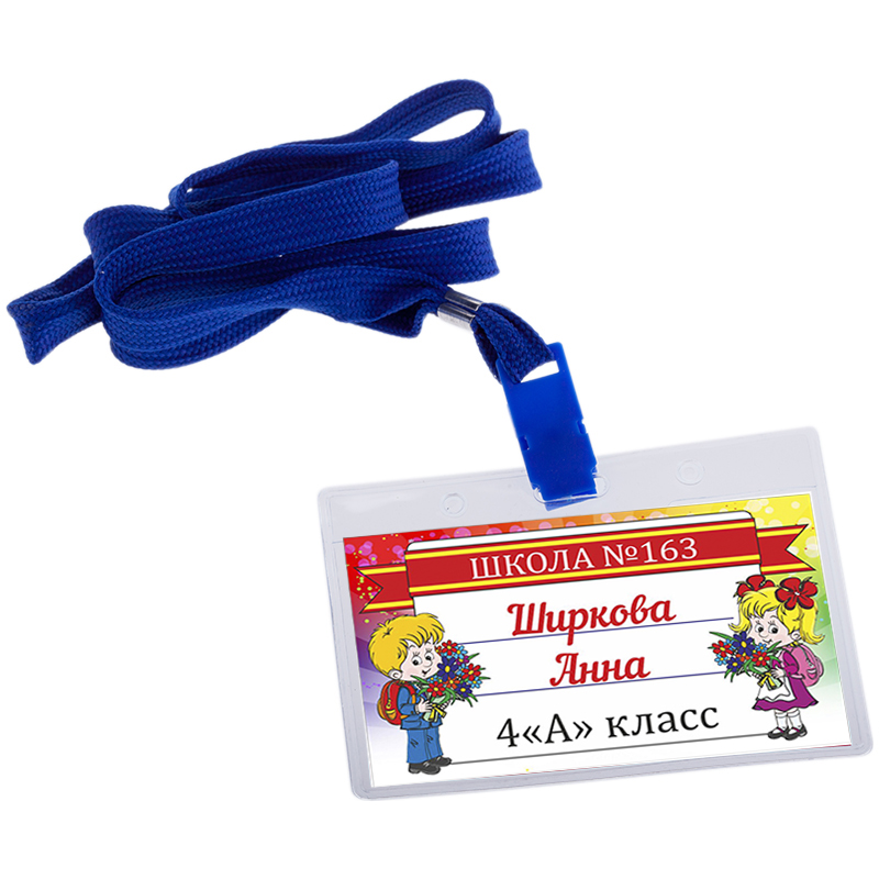 Именной бейдж для первоклассника из прозрачного мягкого пластика со шнурком с клипсой.