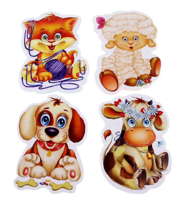 Эти забавные животные помогут малышу научиться собирать пазлы! В наборе мягких пазлов вы найдете 4 объемные картинки, разделенные на 4-5 элементов из мягкого материала, который приятно держать в руках. Яркие и контрастные изображения легко собирать, а детали хорошо сцепляются вместе, благодаря чему с готовыми картинками можно играть. Мягкие пазлы полезны для развития у детей внимательности и пространственного мышления.
