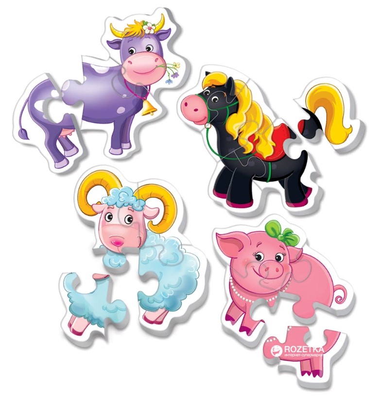 Изучаем домашних животных и учимся собирать пазлы! Эти головоломки для самых маленьких отлично развивают координацию движений, зрительную память и мышление. Крупные детали пазлов мягкие и приятные на ощупь, их удобно держать в детских ручках. Каждая картинка состоит из 3-5 элементов, поэтому ребенок не запутается в них.