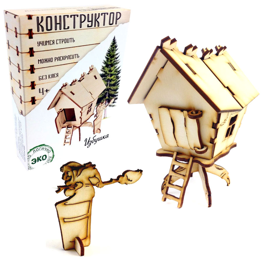 Конструктор из дерева – избушка Бабы Яги с открывающейся дверью. В комплекте – избушка с лестницей фигурка Бабы Яги. Конструктор собирается без клея. Собранную модель можно раскрасить карандашами, красками или фломастерами.