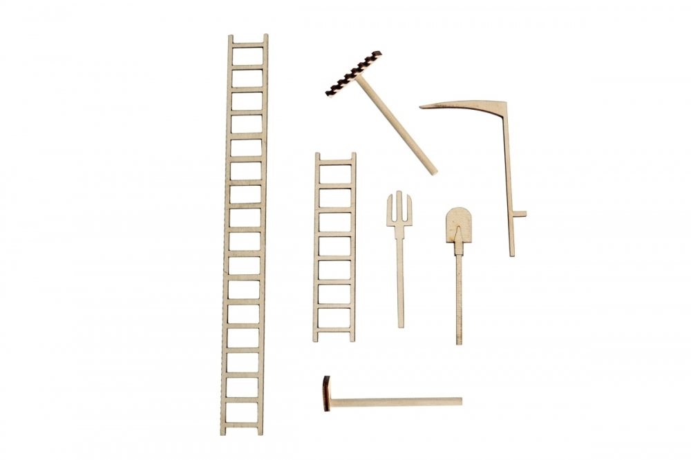 - У собранной модели открываются ворота, а так же в комплект входит забор и рабочий инвентарь