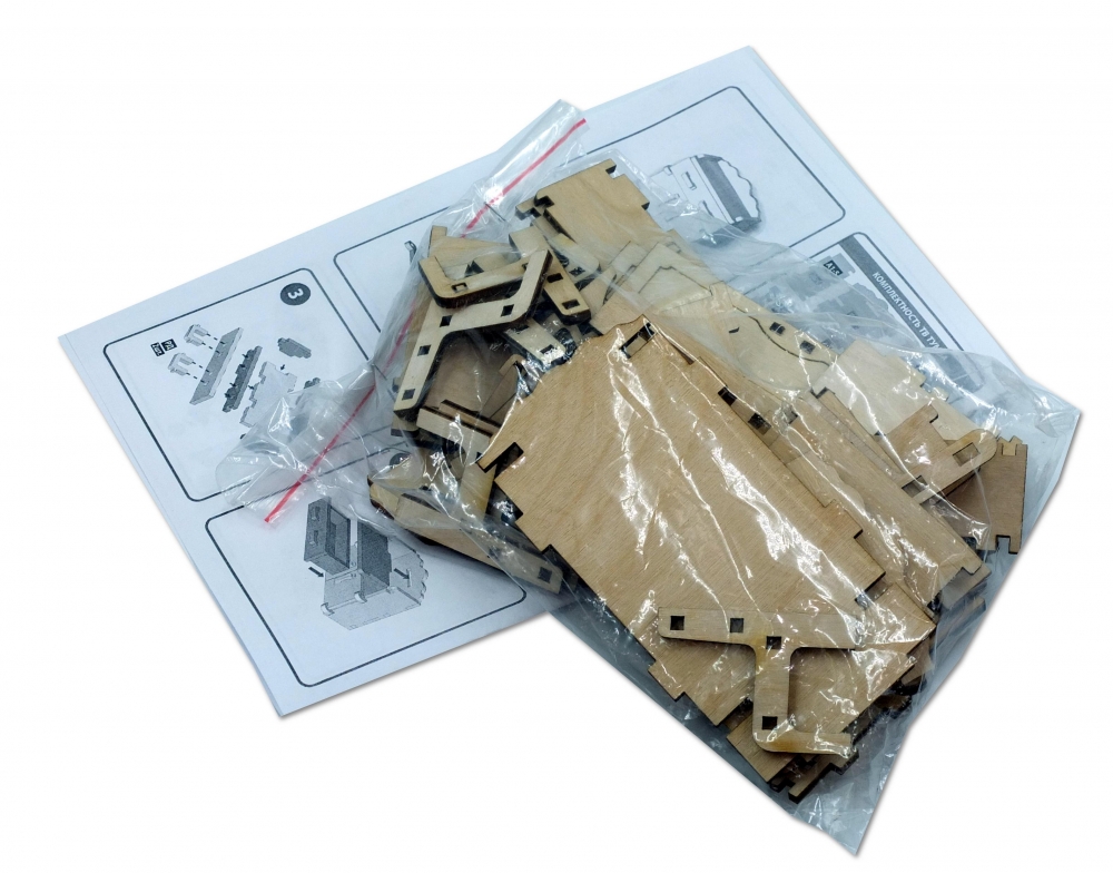 Мебель выполнена из березовой фанеры, но небольшие детали, например, ручки на дверцах, сделаны из пластика. Все элементы собираются без клея, просто вставляются в пазы, крепление очень прочное и надежное.