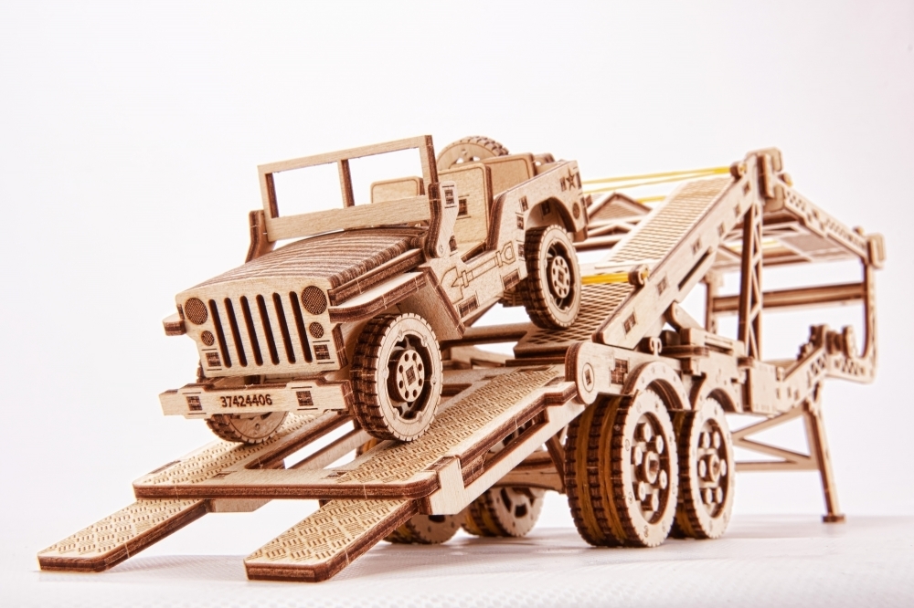 Теперь ваш тягач имеет завершенный вид, и вы можете смело перевозить на нем небольшие модели машин. Это станет отличным вариантом для подарка ребенку. Все материалы, из которых изготавливаются конструкторы, экологически чистые и вы можете доверить вашему ребенку играть с собранными конструкторами Wood Trick.