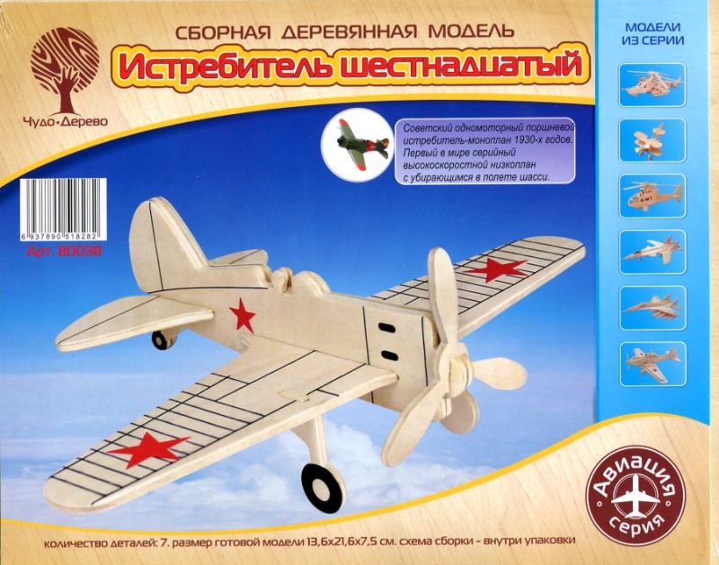 3D-конструктор "Истребитель шестнадцатый" предлагает юному творцу собрать деревянную модель истребителя-моноплана. Детали выдавливаются из фанерной доски и собираются согласно инструкции. Собираются без клея.