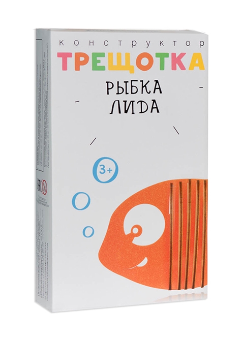 Конструктор из дерева и мягкого вспененного полимера. В результате сборки получается милая рыбка-трещотка, которая трещит как погремушка, если ее потрясти. Конструктор собирается без клея. Рыбку можно раскрасить карандашами, красками или фломастерами.