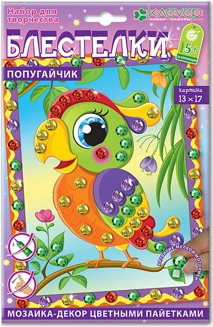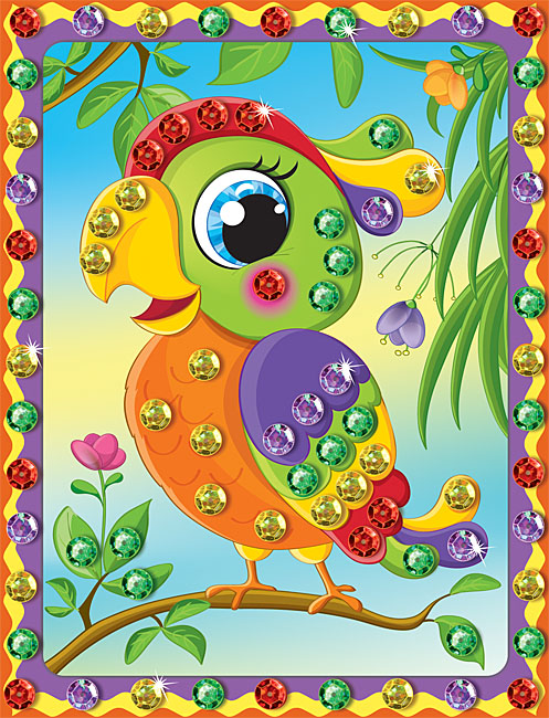 Разноцветный попугайчик красуется и поёт среди экзотических цветов в пышных кронах южных деревьев. Мини-картины серии «Блестелки» - первые шаги ребёнка старше 5 лет в освоении интересной и красочной техники мозаики. Это самый простой пример мозаики - не сплошное составление картины из мелких элементов, а декорирование её отдельных частей. Украсьте картину разноцветными искрящимися пайетками! Без клея - аккуратно и чисто!