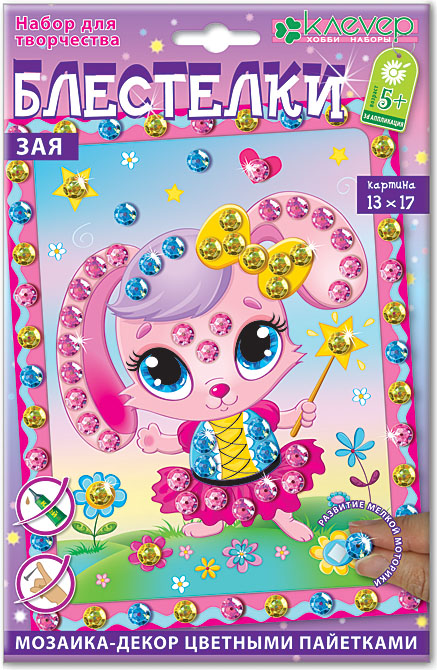 Очаровательная зайка, словно маленькая фея, взмахом волшебной палочки покоряет с первого взгляда. Мини-картины серии «Блестелки» - первые шаги ребёнка старше 5 лет в освоении интересной и красочной техники мозаики. Это самый простой пример мозаики - не сплошное составление картины из мелких элементов, а декорирование её отдельных частей. Украсьте картину разноцветными искрящимися пайетками! Без клея - аккуратно и чисто!