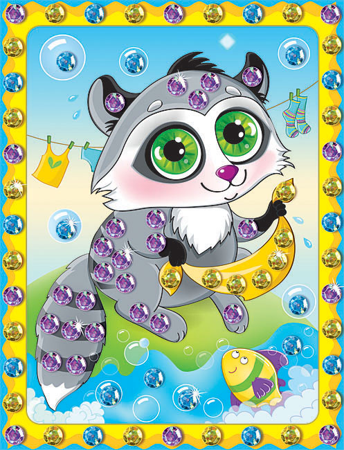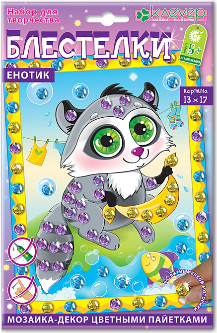 Енотик-чистюля старательно полощет бельё и вокруг разлетаются радужные мыльные пузырьки. Мини-картины серии «Блестелки» - первые шаги ребёнка старше 5 лет в освоении интересной и красочной техники мозаики. Это самый простой пример мозаики - не сплошное составление картины из мелких элементов, а декорирование её отдельных частей. Украсьте картину разноцветными искрящимися пайетками! Без клея - аккуратно и чисто!