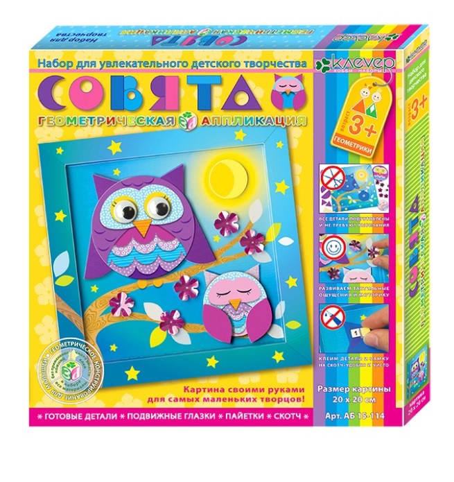 Малыш старше 3 лет легко сам соберёт картину с совами из разных по форме картонных деталей - кругов, треугольников, полукругов и сегментов круга, наклеит большие подвижные глазки и украсит фон блестящими розовыми цветами-пайетками. Собирая картину, малыш познакомится с разными фигурами и разными материалами, а взрослый, складывая края картины в рамку, покажет малышу, как из плоского листа получается объёмная картина.