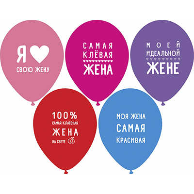 Высококачественный шар из натурального латекса. Ассорти цветов, одного типа - пастель - матовый оттенок цвета. Шары с двусторонним шелкографическими рисунком - надписями: Я люблю свою жену, Самая клевая жена. Моей идеальной жене, Самая классная жена на свете, Моя жена самая красивая!