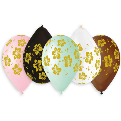 Воздушные шары из натурального латекса c шелкографическим одноцветным золотым стилизованным рисунком цветка Гибискуса нанесенным по всему шару. В наборе используются шары нежных пастельных оттенков с добавлением шаров контрастного черного цвета и прозрачных шаров типа кристалл. Предназначены для использования как в оформлении, так и в розничной продаже. Размер шаров в надуве - 35 см, продаются не надутыми, подходят для надува как гелием, так и воздухом при помощи ручного насоса.