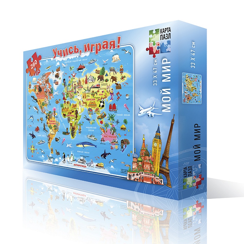 Пазл "Мой мир" поможет весело и познавательно изучить с ребенком окружающий мир. Собирая яркие и красочные детали головоломки, ребёнок сможет запомнить как выглядят континенты и узнать какие интересные особенности и достопримечательности на них находятся. Пазл помогает развить мелкую моторику рук, воображение и кругозор.