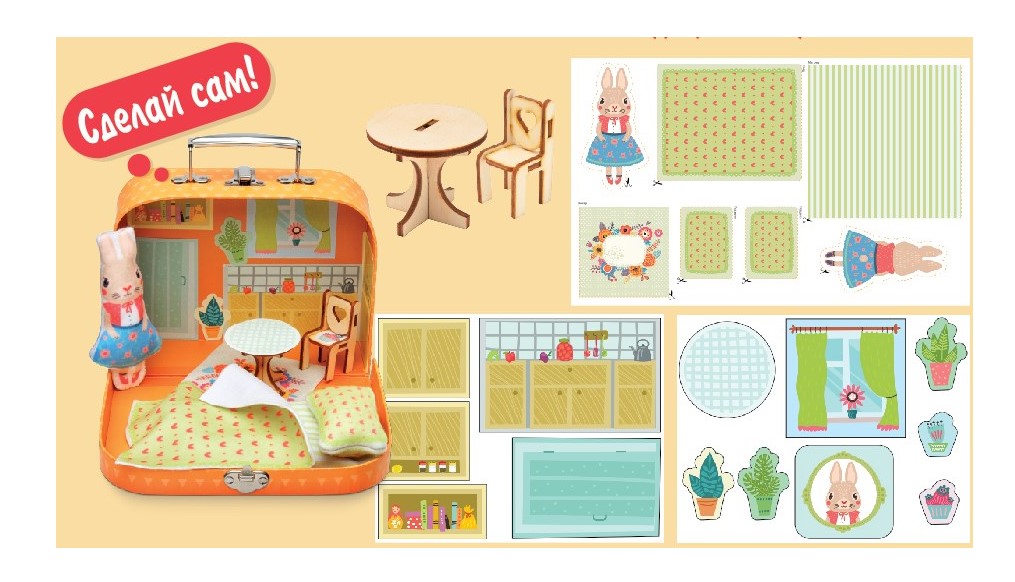 Набор «Мой уютный домик» — новая оригинальная разработка. Серия чемоданчиков, внутри которых скрывается целый кукольный мир. Дети учатся делать игрушки своими руками, а чемоданчик не только служит местом для их хранения, но и легко превращается в дом для куклы, который можно брать с собой куда угодно.