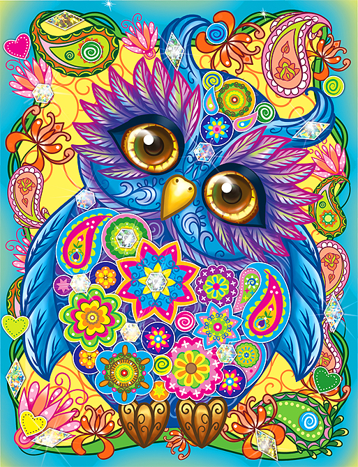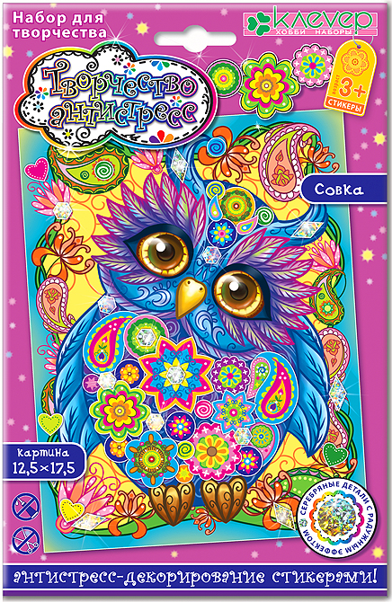 Волшебство техники «антистресс-декорирование стикерами» вовлекает в процесс творчества даже самых маленьких детей: ребёнок старше 3 лет вместе с мамой наклеит узорные разноцветные стикеры и блестящие голографические элементы на изображение забавной Совки, и картинка заиграет яркими цветами и солнечными зайчиками – прямо как в сказке!