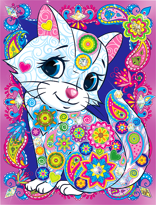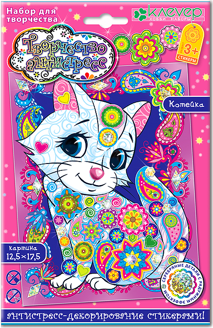 Волшебство техники «антистресс-декорирование стикерами» вовлекает в процесс творчества даже самых маленьких детей: ребёнок старше 3 лет вместе с мамой наклеит узорные разноцветные стикеры и блестящие голографические элементы на изображение ласкового Котейки, и картинка заиграет яркими цветами и солнечными зайчиками – прямо как в сказке!