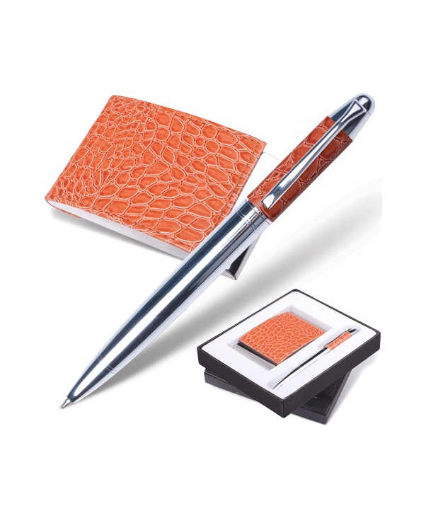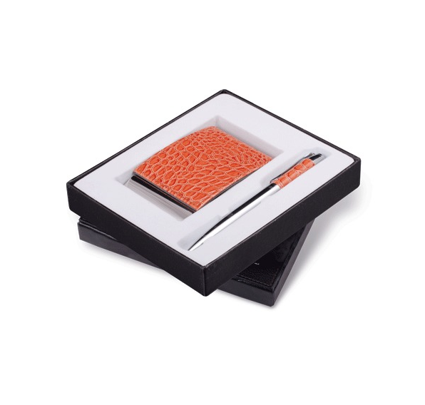 Элегантный подарочный набор с отделкой коричневого цвета "под кожу крокодила" эффектно дополнит образ успешного и уверенного в себе человека. Набор включает шариковую ручку и визитницу.