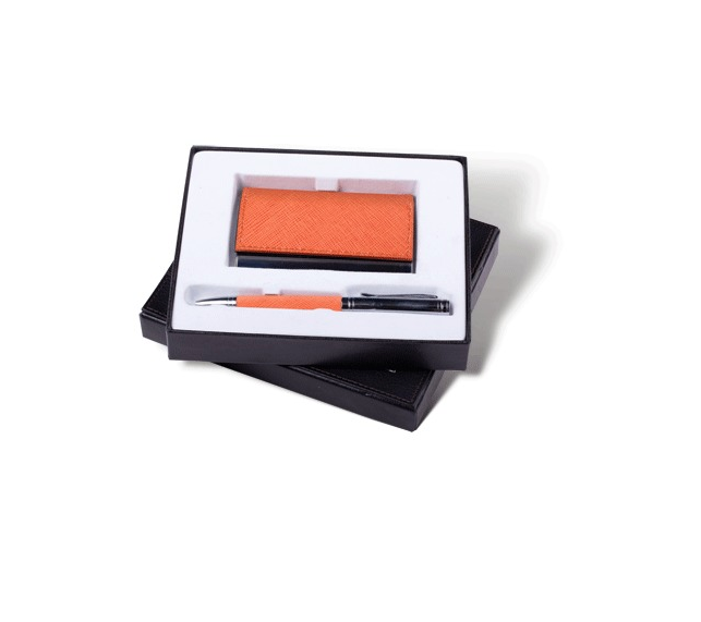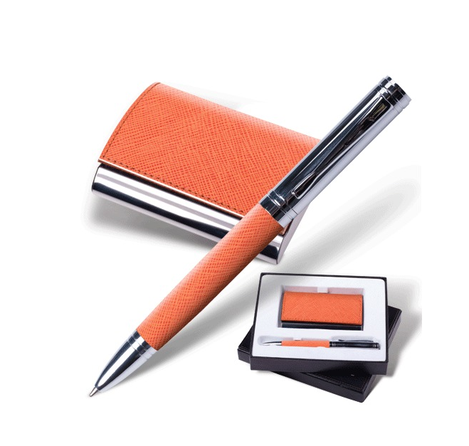 Яркий и стильный подарочный набор. Хромированные детали эффектно сочетаются с отделкой "фактурной кожей" оранжевого цвета. Набор включает шариковую ручку и визитницу.