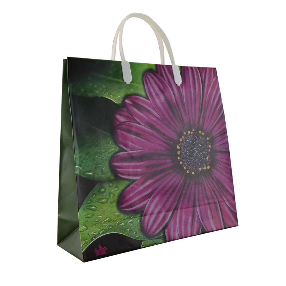 Красивый подарочный пакет с пластиковыми ручками. Пакет сделан из прочного, мягкого пластика с ярким принтом.