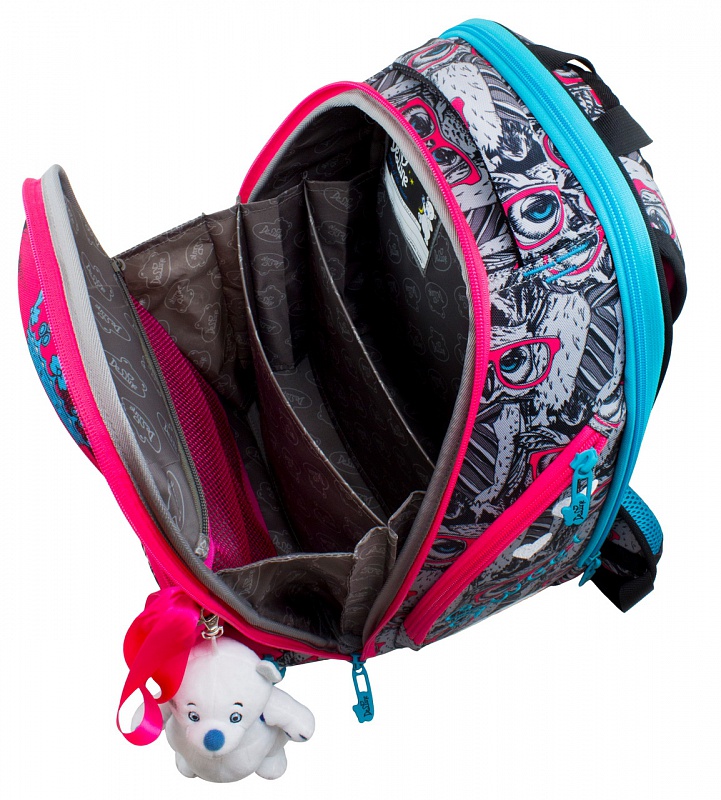 - Ранец имеет 2 отделения. При открытии центрального отделения раздвигаются разделители (книжка), так же в нем находится карман-сеточка на молнии.