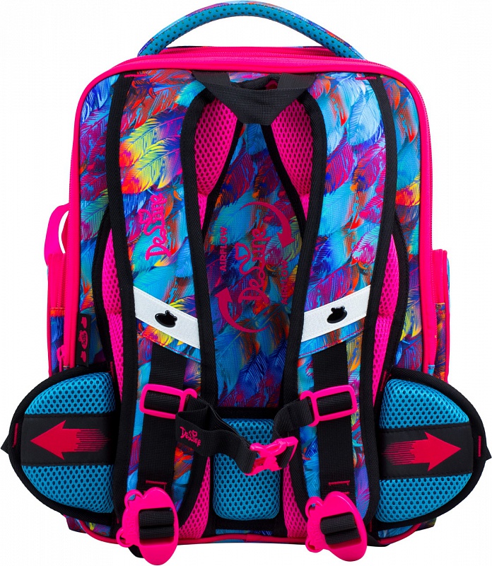 Эргономичная спинка ранца, разработана по новым технологиям, учитывающие особенности анатомии ребенка. Позвоночник защищен специально сконструированной спинкой с саморегулирующей боковой поддержкой, которая при ходьбе не позволяет смещаться ранцу в стороны, надежно фиксируя на пояснице, и подходит ребенку любой комплекции. Надежная фиксация делает ношение максимально удобным.