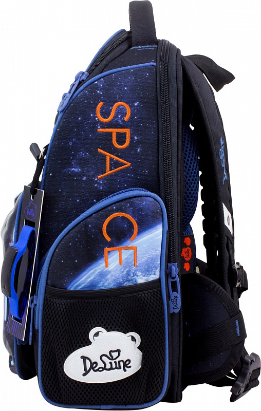 - На передней части ранца расположен большой карман с отделением для письменных принадлежностей и два боковых кармана на молнии + карман сеточка для бутылок.