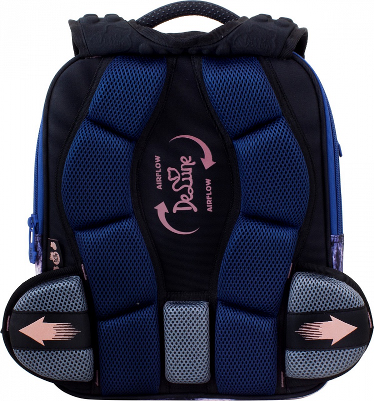 Эргономичная спинка ранца, разработана по новым технологиям, которые учитывают все особенности анатомии ребенка. Позвоночник защищен специально сконструированной спинкой с саморегулируемой боковой поддержкой, которая при ходьбе не позволяет смещаться ранцу в стороны, надежно фиксируя на пояснице, и подходит ребенку любой комплекции. Надежная фиксация делает ношение максимально удобным.