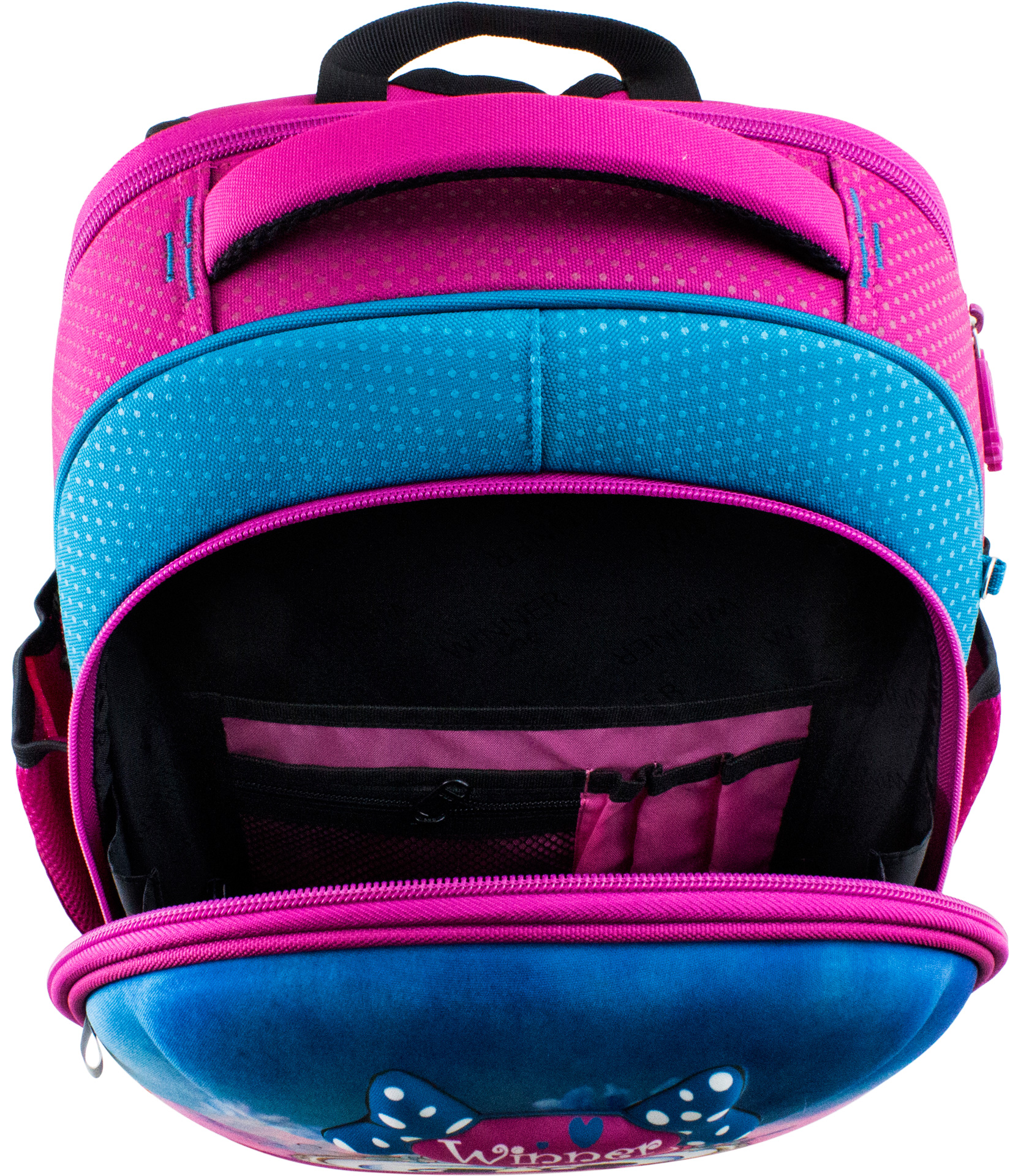 Основное большое отделение у спины, с тканевыми разделителями, для школьных принадлежностей.