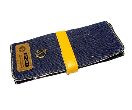 Раскладной пенал джинс на кожаном ремешке с кнопкой.