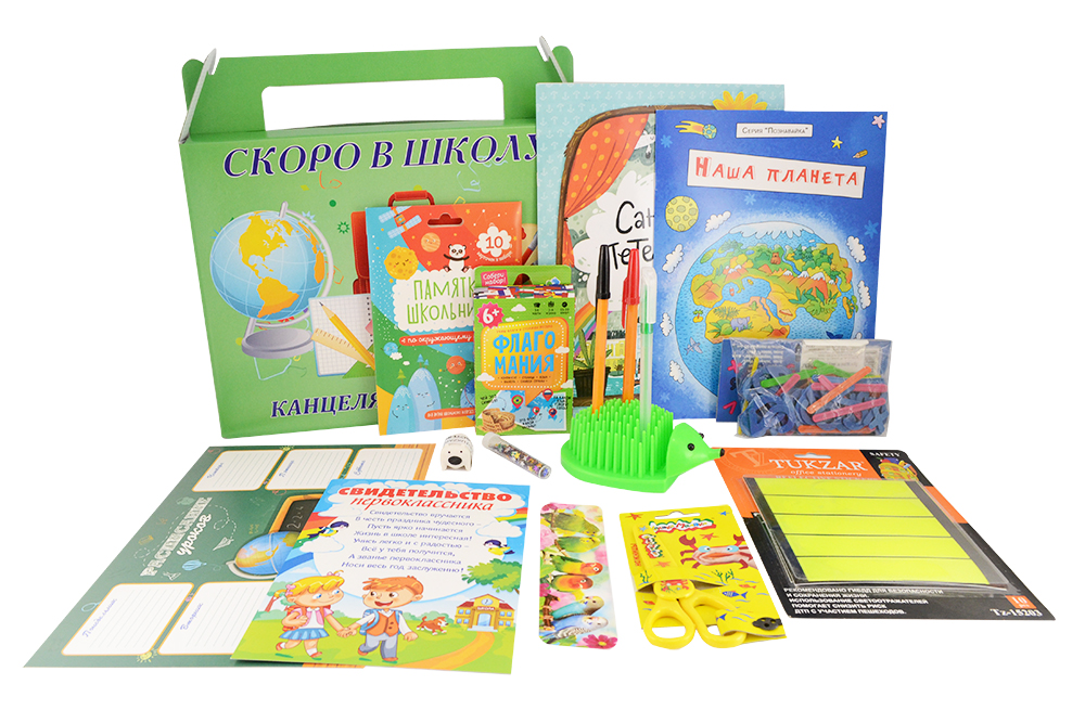 Набор канцелярских принадлежностей для будущего первоклассника! Набор укомплектован в картонную коробку с крепкими ручками.
