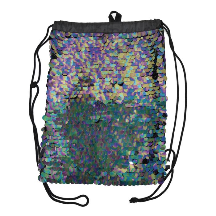 Рюкзак-мешок выполнен из ткани, расшитой пайетками, с лямками, регулируемыми по длине. Основное отделение затягивается шнурком.