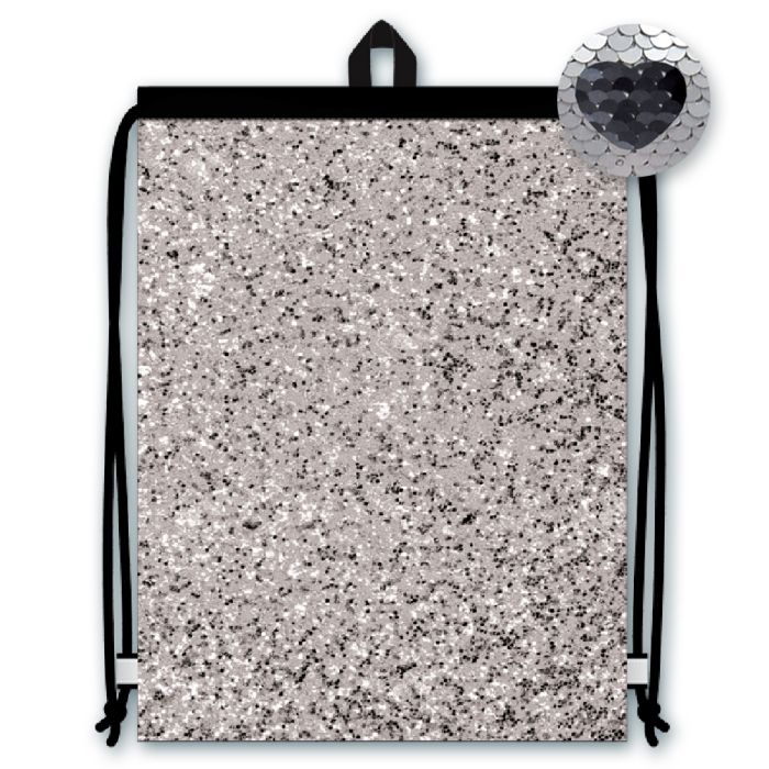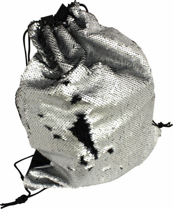 Рюкзак-мешок выполнен из ткани, расшитой глянцевыми и матовыми двухсторонними пайетками. Основное отделение затягивается шнурком.