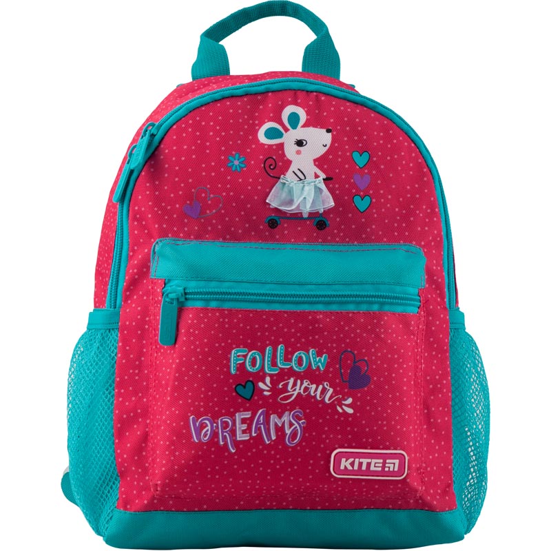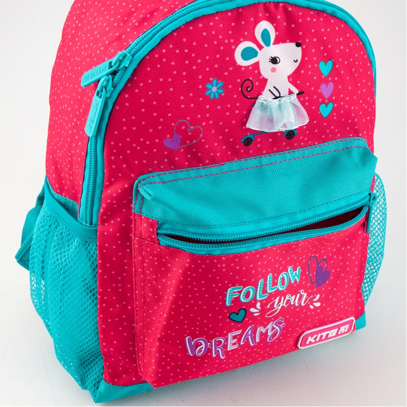 Детский рюкзачок для девочки Kite K19-534XS-2 украшен принтом с мышкой и надписью "Follow your dreams". Яркий аксессуар "как у взрослых" поможет маленьким модницам научиться собирать вещи на прогулку или на занятие.