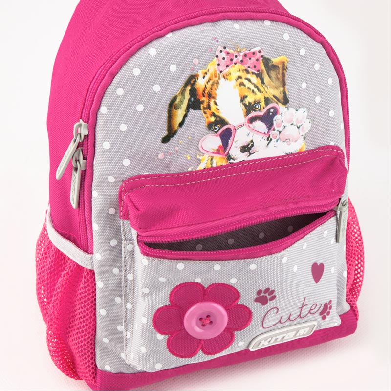 Детский рюкзачок для девочки Kite K19-534XXS-2 украшен изображением песика и отделкой-цветком с пуговкой. Милый аксессуар "как у взрослых" поможет маленьким модницам научиться собирать вещи на прогулку или на занятие.