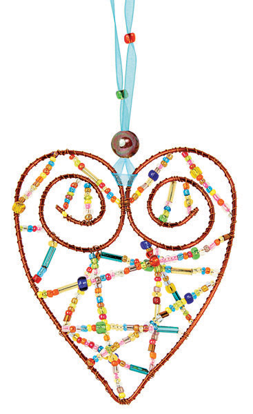 Интересное изделие - декоративная подвеска, очень простая в исполнении: нужно выгнуть толстую проволоку по контуру в инструкции, обмотать ее тонкой проволокой и, нанизывая бисер, заполнить внутреннее пространство каркаса искрящимися бисерными нитями. Особенно эффектно эта вещица будет смотреться на окне или на люстре: там она будет переливаться в лучах света всеми цветами радуги.