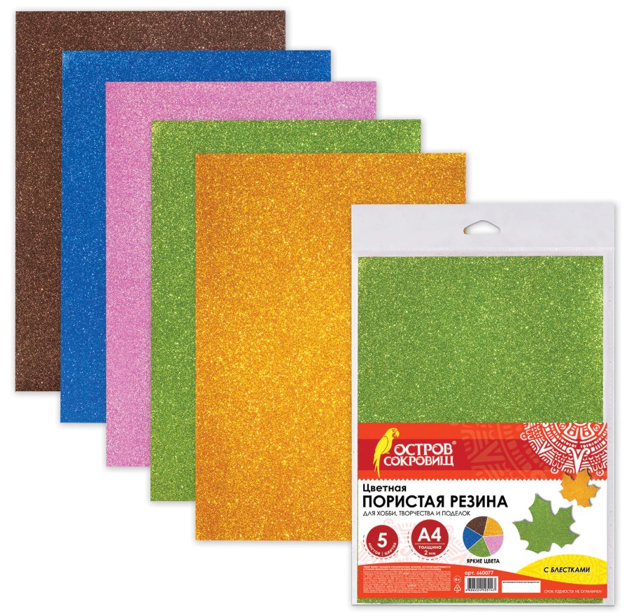 Цветная пористая резина (фоамиран), А4, толщина 2 мм, ОСТРОВ СОКРОВИЩ, 5 листов, 5 цветов, яркий блеск