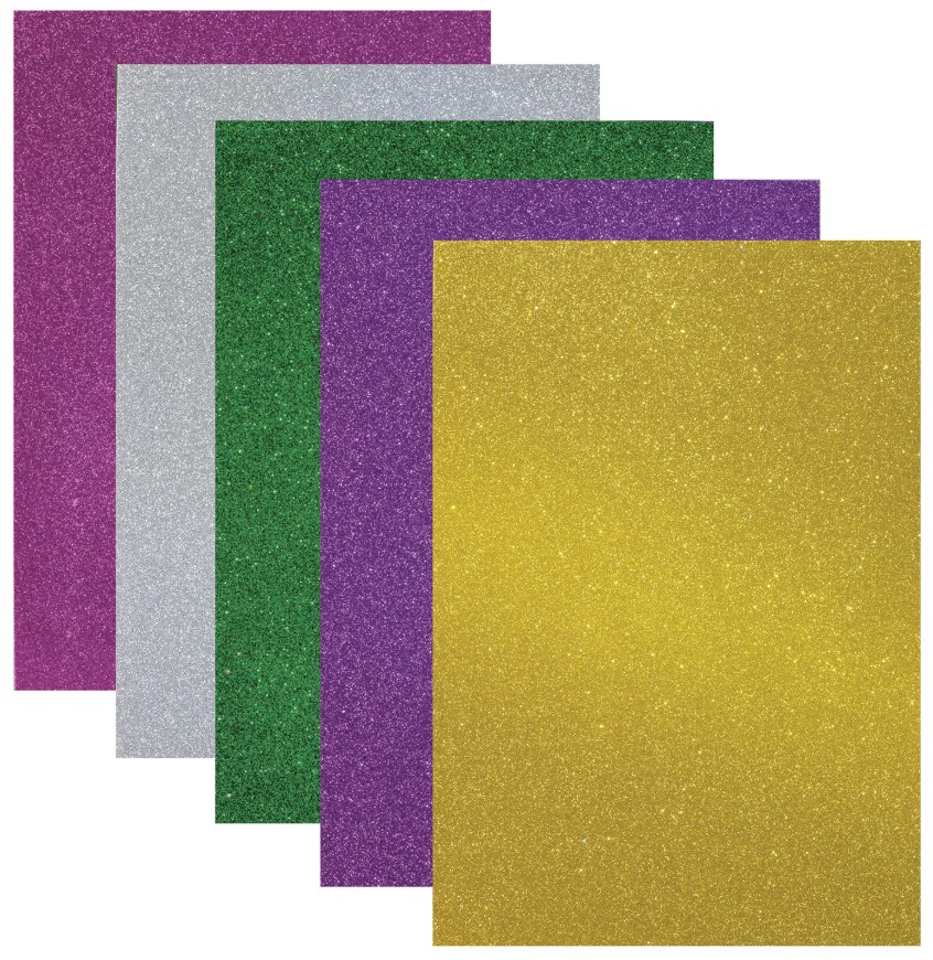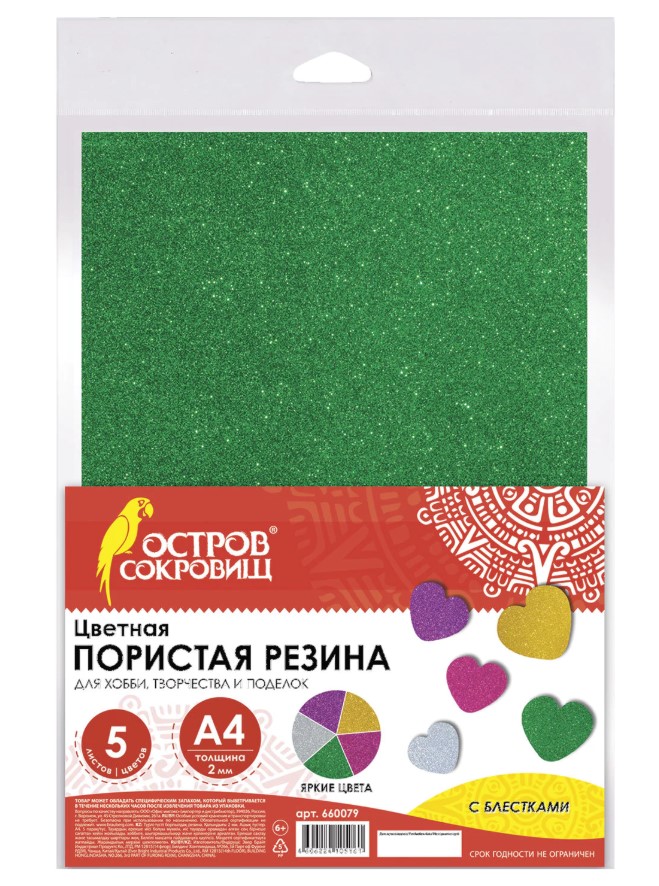 Цветная пористая резина (фоамиран), А4, 2 мм, ОСТРОВ СОКРОВИЩ, 5 листов, 5 цветов, блестки