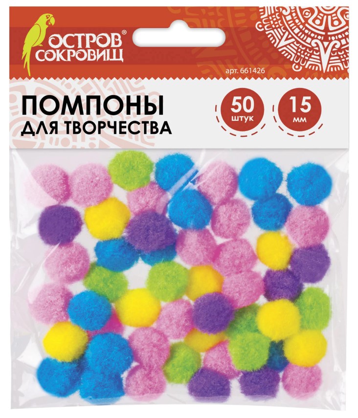 Помпоны для творчества, 5 цветов, 15 мм, 50 шт., ОСТРОВ СОКРОВИЩ, 661426