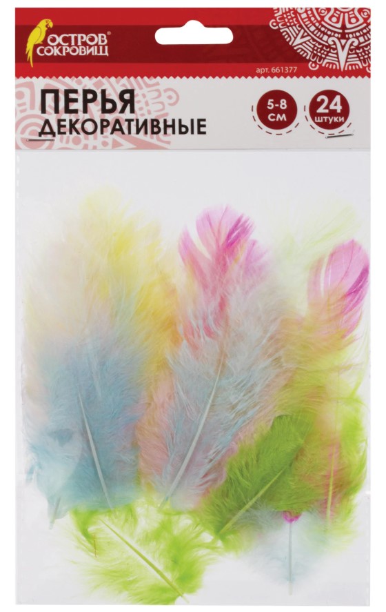 Перья декоративные "Карнавальные", 5-8 см, 24 штук, 6 цветов, пастель, ассорти, ОСТРОВ СОКРОВИЩ, 661377