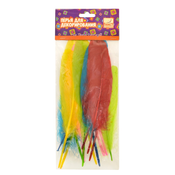 В набор входят яркие разноцветные перья для декорирования, предназначенные для различных поделок, бижутерии, украшения одежды.