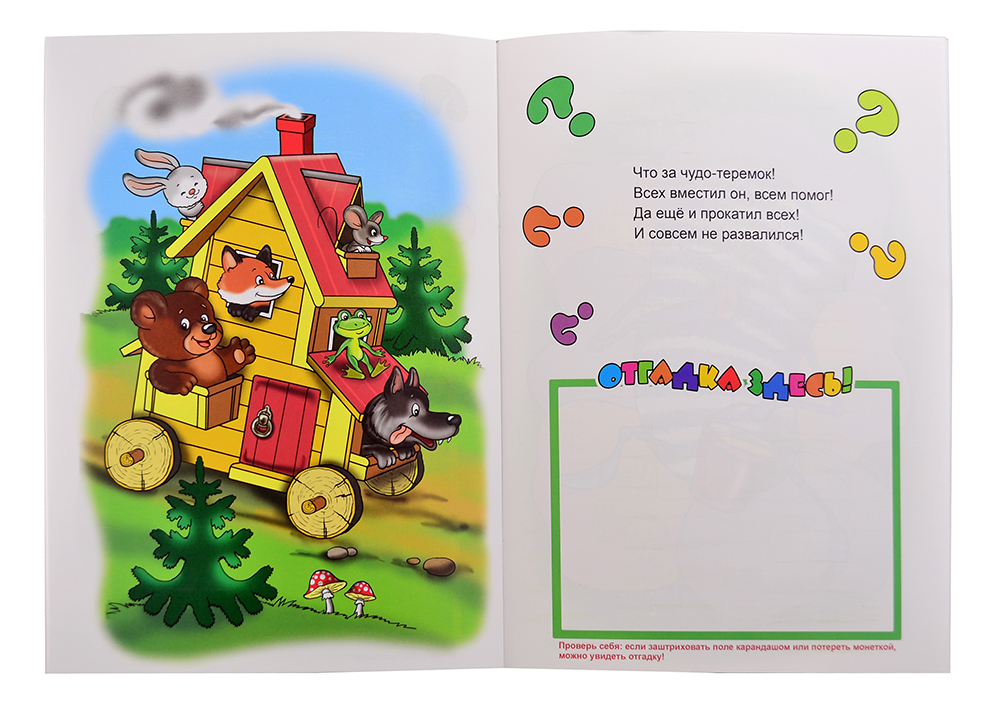 Эта детская брошюра содержит ряд детских загадок в стихотворной форме с цветными иллюстрациями. Под каждой загадкой есть пустое поле, в которе ребенок может записать свой ответ. С помощью простой монеты можно стереть защитный слой на этом поле, под которым находится правильная отгадка. Отгадывание этих загадок не только позволит ребенку с интересом провести время, но и поможет ему развить способность логически мыслить.