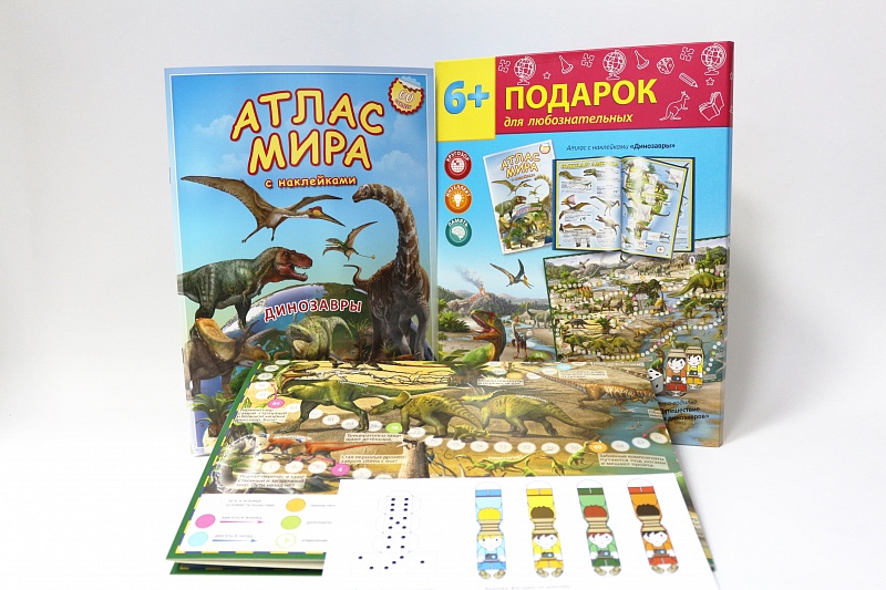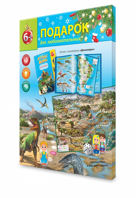 Яркий и познавательный комплект: Игра-ходилка «Путешествие в мир динозавров» и Атлас мира «Динозавры» с наклейками — прекрасный подарок для любознательных детей.