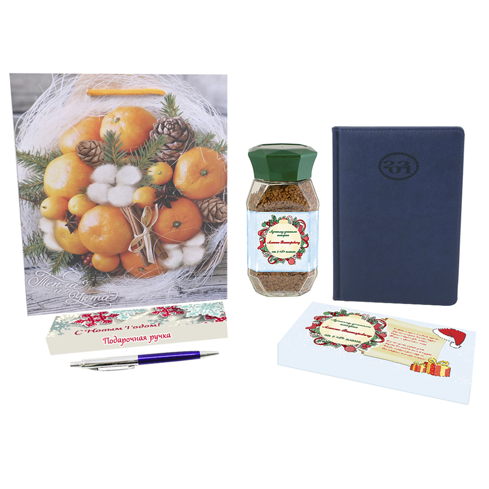 - В наборе: подарочный пакет, кофе, ручка в футляре, конфеты Toffifee, ежедневник