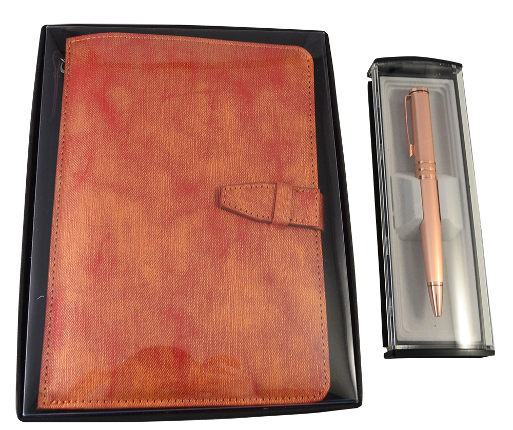 Подарочный набор в красочной упаковке включает в себя стильный ежедневник и шариковую ручку с выдвижным механизмом.