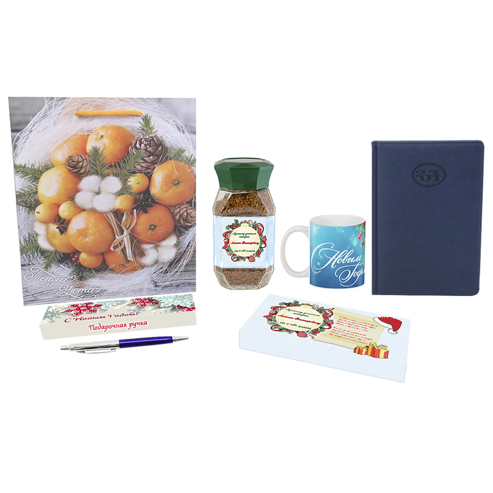 - В наборе: подарочный пакет, кружка, ручка в футляре, кофе, конфеты Toffifee, ежедневник