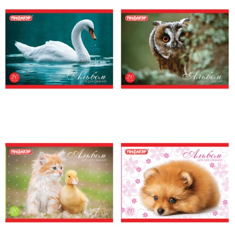 Альбом для рисования А5, 20 листов ПИФАГОР "Животные", 4 вида, 103723