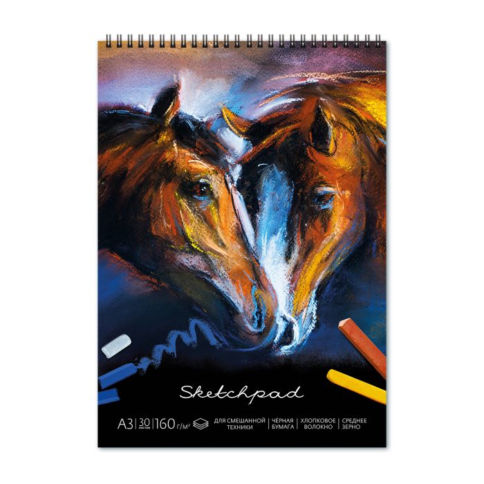 Альбом для пастели (скетчпад) формата А3 отлично подходит для рисования. Внутренний блок состоит из 30 листов черной бумаги с хлопковым волокном. Отлично подходит для любых сухих техник, включая рисунок углем, графитом, цветными карандашами, ручками и тушью, пастелью.