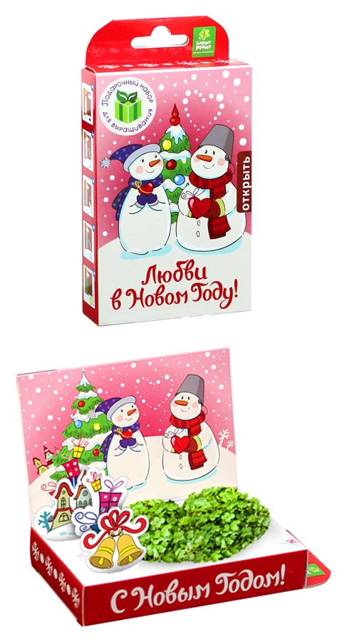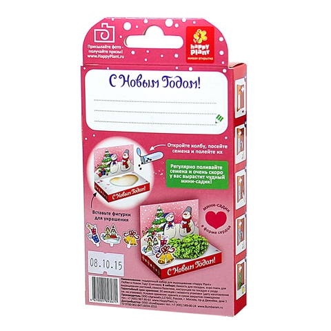 Живая открытка - это удивительный и очень красивый подарок. Маленький садик на вашем столе будет радовать зеленью и зимой, и летом.Открытка представляет собой коробочку, с одной стороны есть место для написания ваших пожеланий.Откройте открытку, высыпьте семена в контейнер, где находится специальный материал для проращивания. Уже через 3-4 дня в открытке вырастет пышный газон из зелени. В комплекте вы найдете 3 тематические фигурки. Их можно разестить рядом с газончиком, вставив в специальные отверстия, а можно поставить прямо в травку. Не забывайте поливать ваш мини-садик, и он будет радовать вас долго.